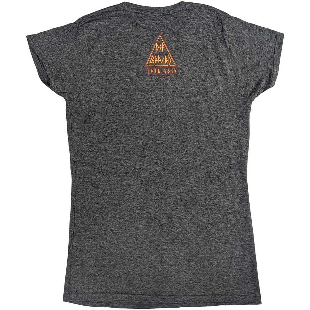 An official licensed Def Leppard Ladies T-Shirt featuring the 'Love Bites Tour 2019' design motif. This high quality T-Shirt is available in a grey colourway.