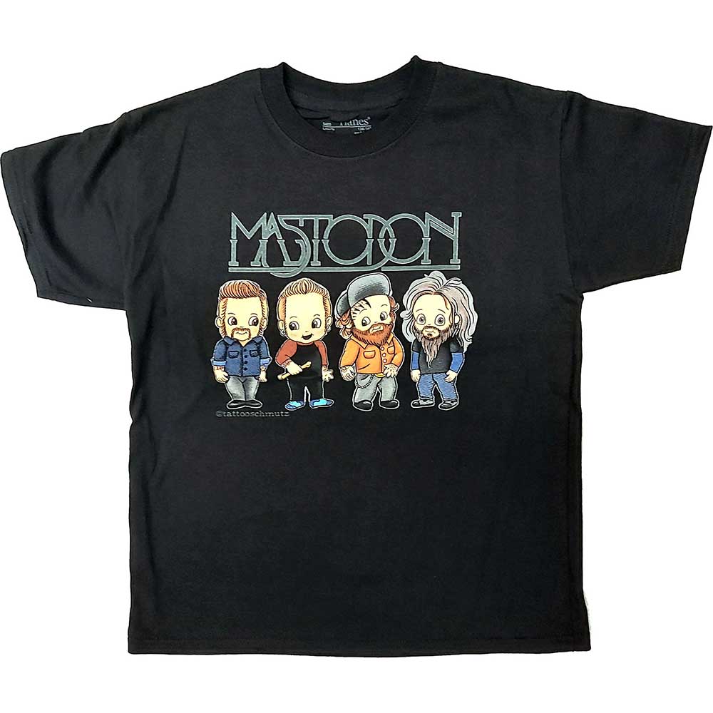 An official licensed Mastodon Kids T-Shirt featuring the Band Character design motif. This high quality T-Shirt is available in a black colourway.