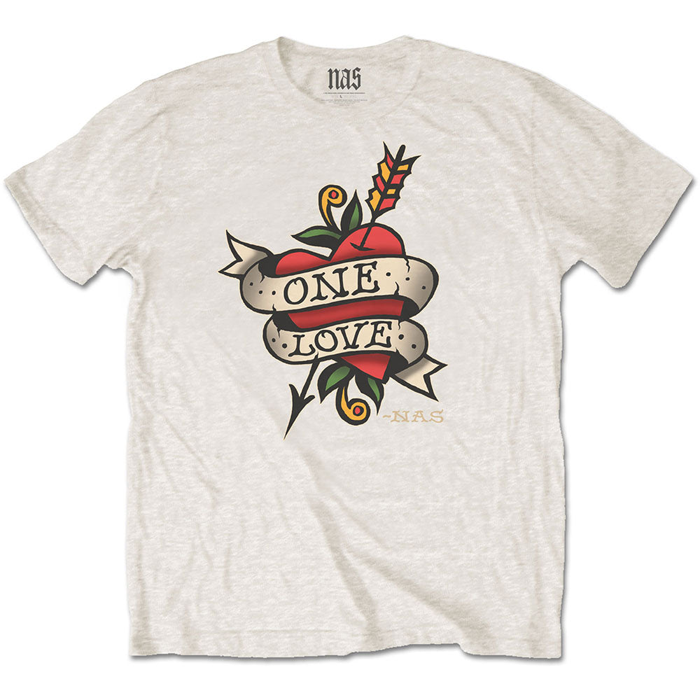 An official licensed Nas Unisex T-Shirt featuring the Love Tattoo design motif. This high quality T-Shirt is available in a black colourway.