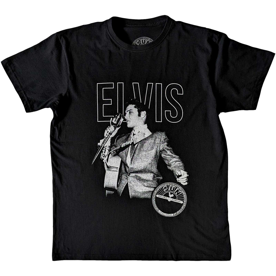An official licensed Sun Records Unisex T-Shirt featuring the 'Elvis Live Portrait' design motif. This high quality T-Shirt is available in a black colourway.